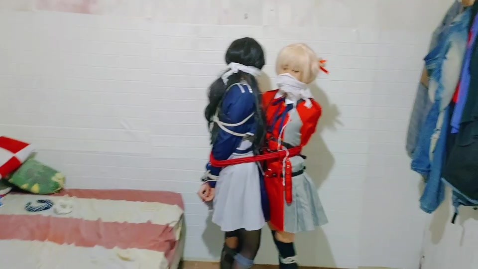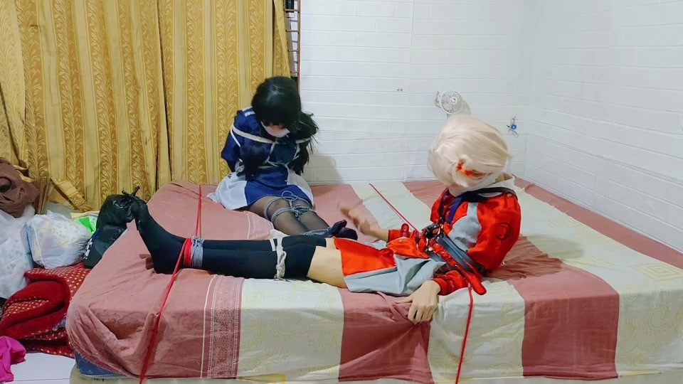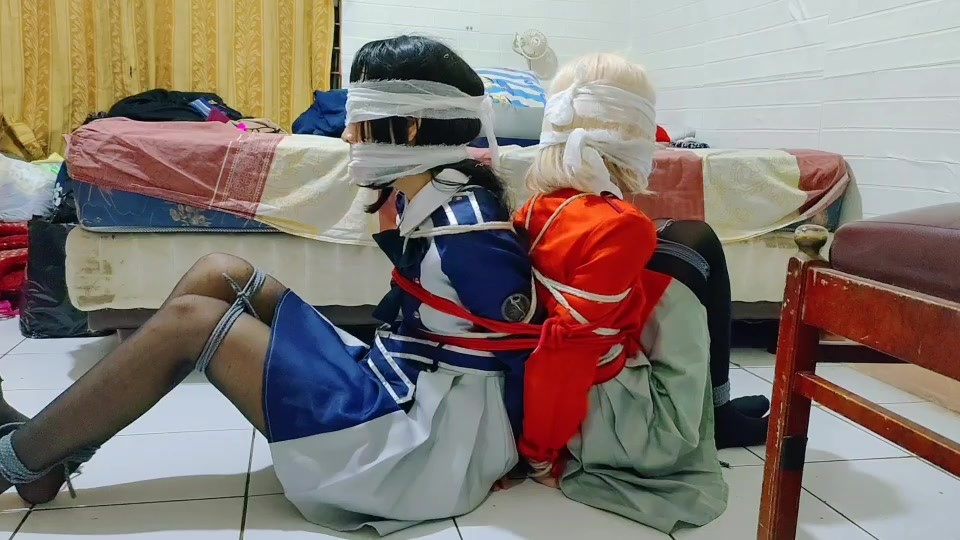第一部分是兩個女孩凍在椅子上,嘴上纏著繃帶。 即使位置背靠背,他們也不能互相幫助。 然後他們被背靠背綁起來,但閉著眼睛,想在繩子上找個縫隙打開逃脫,但太困難了。 第三部分兩個女孩被綁在床上。 它們被固定在床墊上,因此即使嘗試也無法站立。 最後我試著讓他們面對面站起來。 這兩個女孩度過了一個艱難而壓抑的夜晚
