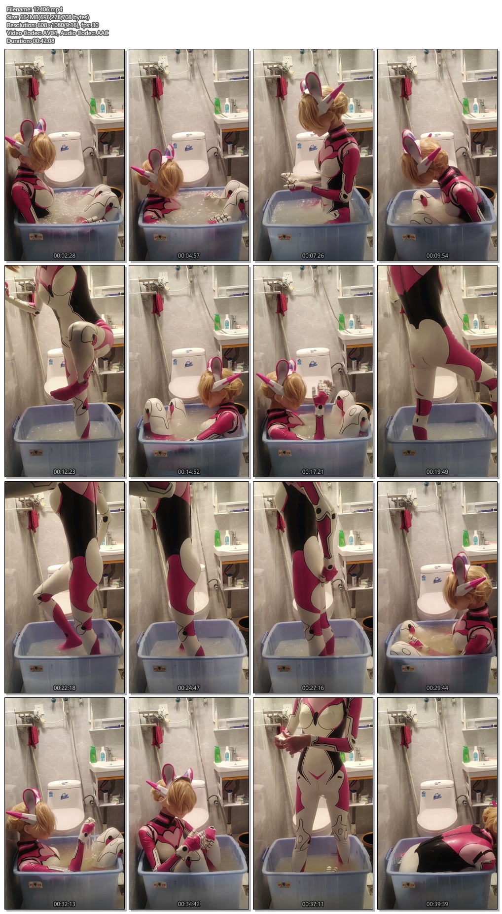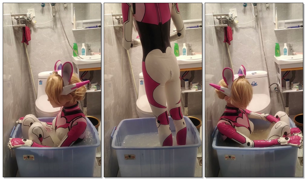【kigurumi】呼吸控制 被黑色胶衣紧紧包裹住的娃娃,绑在浴缸里,头壳下是rf乳胶头套红嘴无法说话,将被怎么玩弄呢~