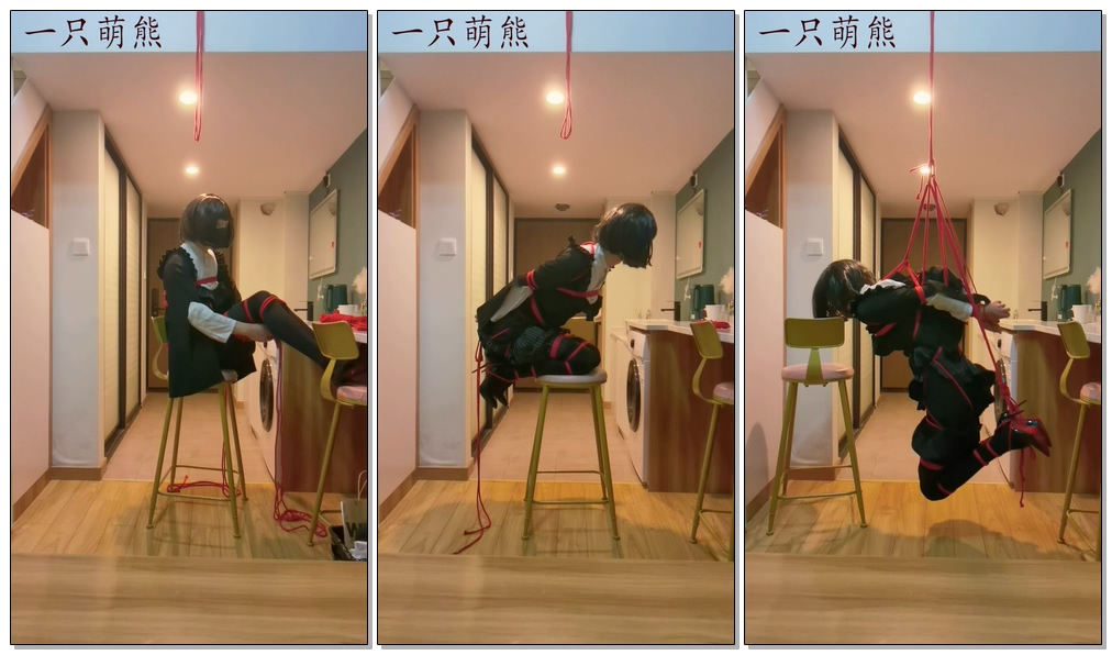绑一个直臂驷马的自缚,先绑个胸和股绳用来承重,然后绑好腿,上到凳子上绑上大臂,让手臂在背后贴紧,把剩的绳子跟腿连接成驷马,然后股绳的绳子从脚腕绳子穿过去在吊点打结,然后把绳圈跟打结剩的绳子绑在一起,双手就可以伸进去了,然后从凳子下来,这种高脚的凳子一旦下去就基本上回不去了,所以一定要留好解开方式,剪刀或者手能够到的地方留活结,萌熊这次把驷马的结打在了脚腕上,直臂刚好能够到,一点点解开腿的绳子,脚着地之后,再慢慢想办法解开手的拘束,大家一定要注意安全