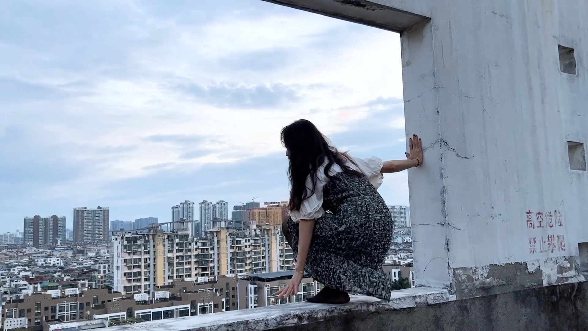 影片从此开始,模特拍摄一段生无可恋的片段,并表现出内心得挣扎和胆怯!然后模特直接前往天台,走到指定区域往楼下看,内心还在不停的挣扎!然后脱下鞋子,