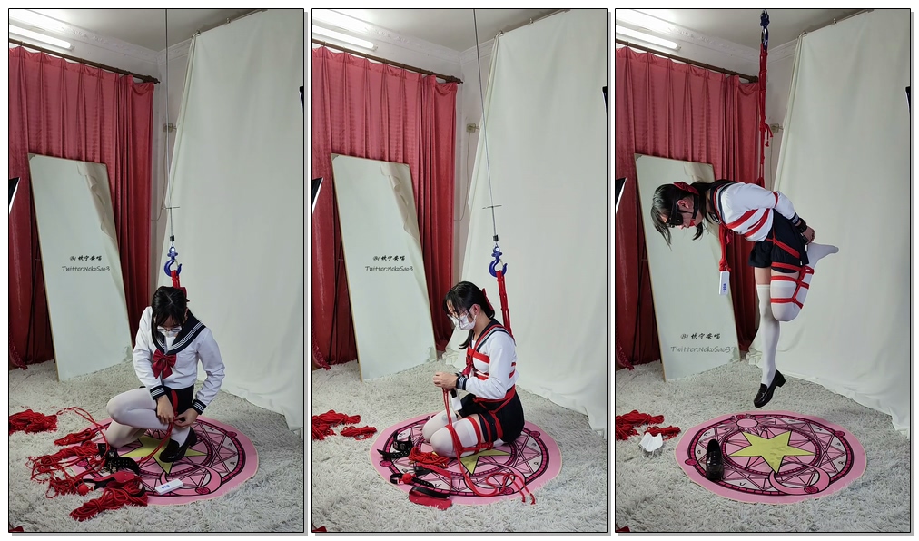 服装是水手服+过膝白丝,捆法是上身后手直臂+胯绳受力+一条腿折腿然后用电葫芦悬吊,道具还是经典的眼罩口枷训练器三件套~