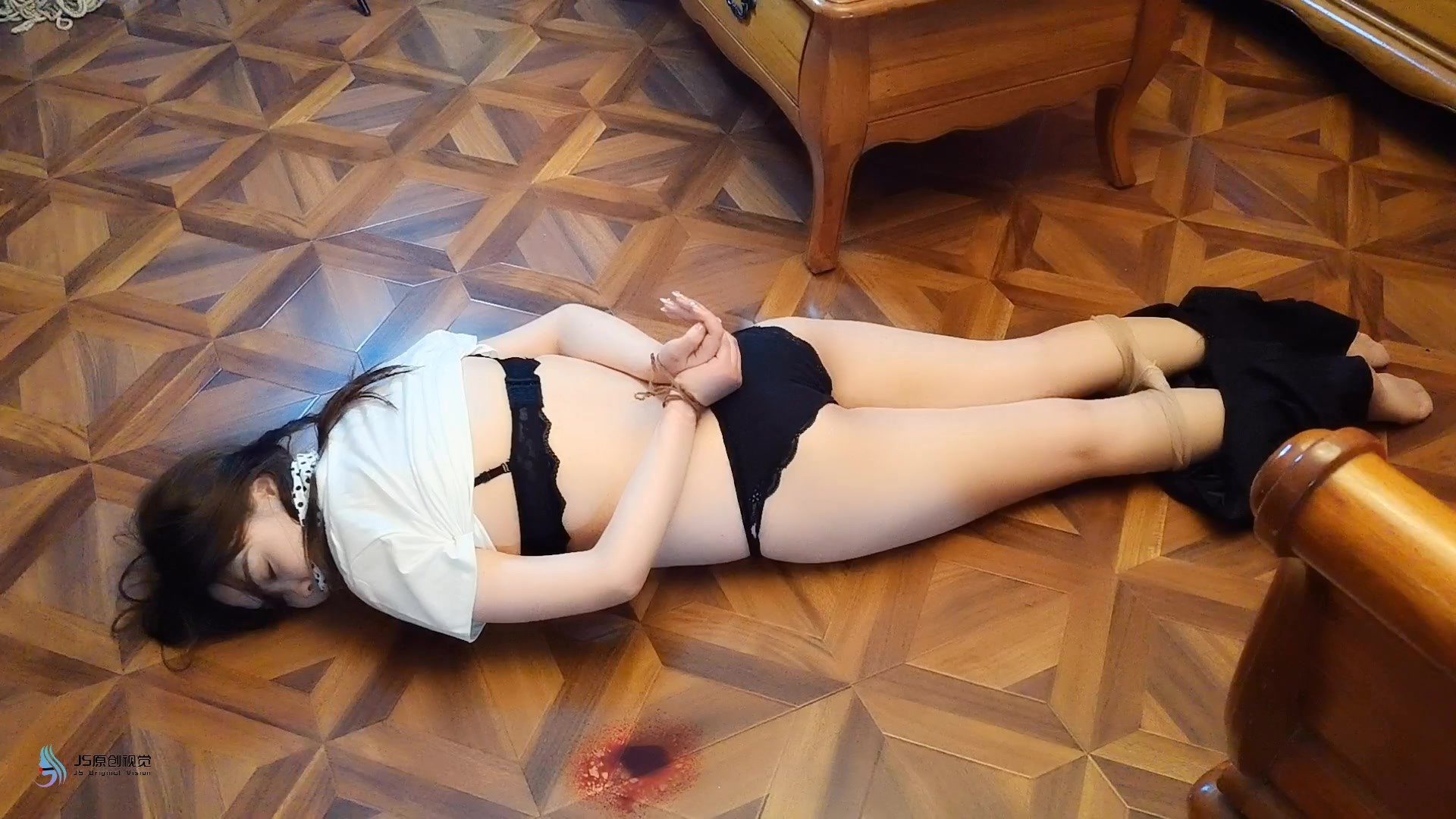 刘芳是一名律师,已经两天没有出来了,她的同事来她家里看看。房门虚掩着,门口有血迹,沿着血迹在客厅里发现了一具尸体。尸体上衣被掀起至脖子,牛仔短裤被脱至大腿呈,丝袜被脱至脚踝俯卧状趴在地上,两手被电线反绑在身后,嘴被布条封住。腹部旁地板上有血迹。(姿势留3分钟) 过了一会儿把尸体翻过来正是刘芳,腹部衣服上的血迹已经凝固。(共5分钟)