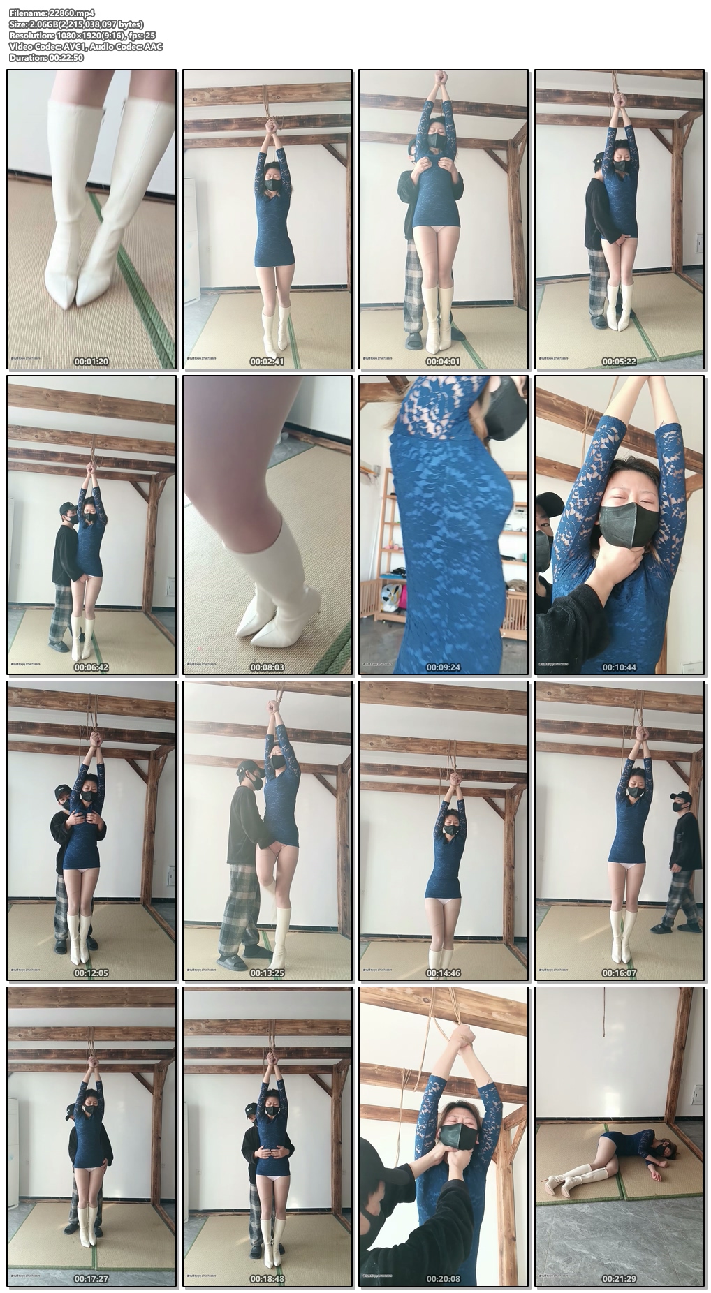 珺珺身着蓝色少妇战袍被双手吊起来,无法动弹,胸部被使劲的揉捏,感觉胸部快要被捏烂了,绑匪折磨完还是不解气,于是掐起他的脖子把他高高举起,最终珺珺窒x而死,匪徒于是决定奸shi.