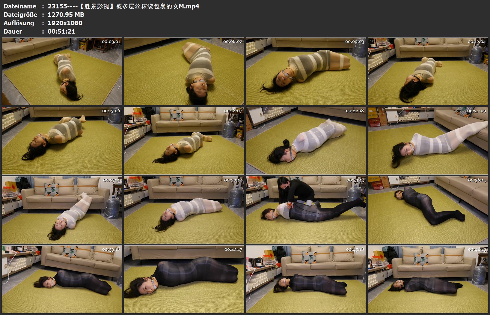 女M首先被胶带捆绑全身,接着戴上口球套上丝袜袋,女M挣扎一会感觉不够紧继续套上一个丝袜袋,把女M放置在地上蠕动挣扎,最后在套上一个黑色丝袜袋,紧紧的包裹住女M