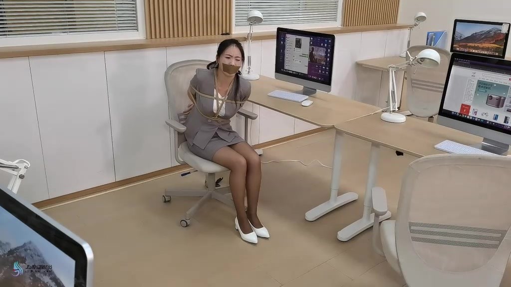 2)在下一个场景中,接待员穿着棕色制服连裤袜和白色高跟鞋被捆绑在椅子上。她正在努力的发出“嗯”的声音。
