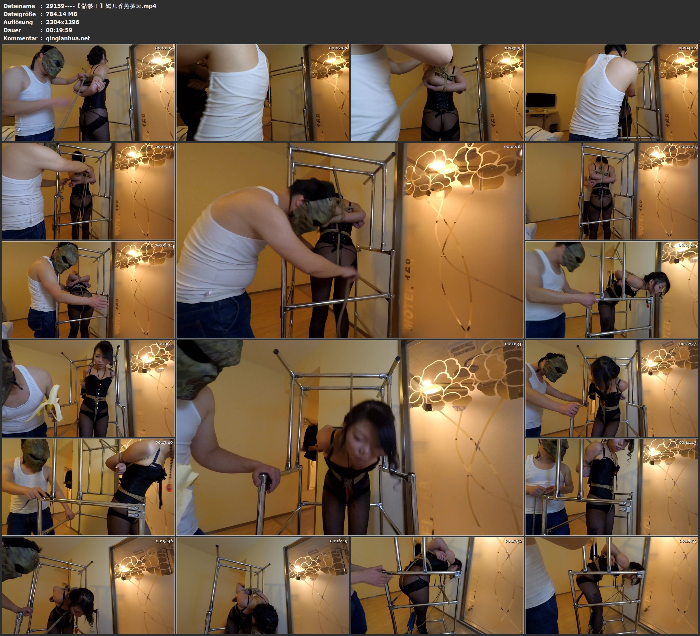 M嫣儿再次被绑在金属架上,和之前不同的是这次加上了道具香蕉,嫣儿先试用舌头舔,后又用嘴做起了活塞运动