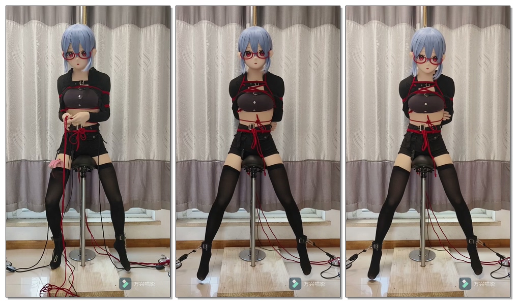 上半身用常规的日式牢牢绑在身后的柱子上,玩具打开后,就只有上半身能微微扭动,被玩具折磨的再厉害,双腿也动弹不了分毫,就连稍微夹紧一点大腿都不可能,就算去了,也只能保持岔开双腿的姿势原地颤抖(本来是想要在木马上加一根假XX的,但不太好固定,一个人也上不去qwq)