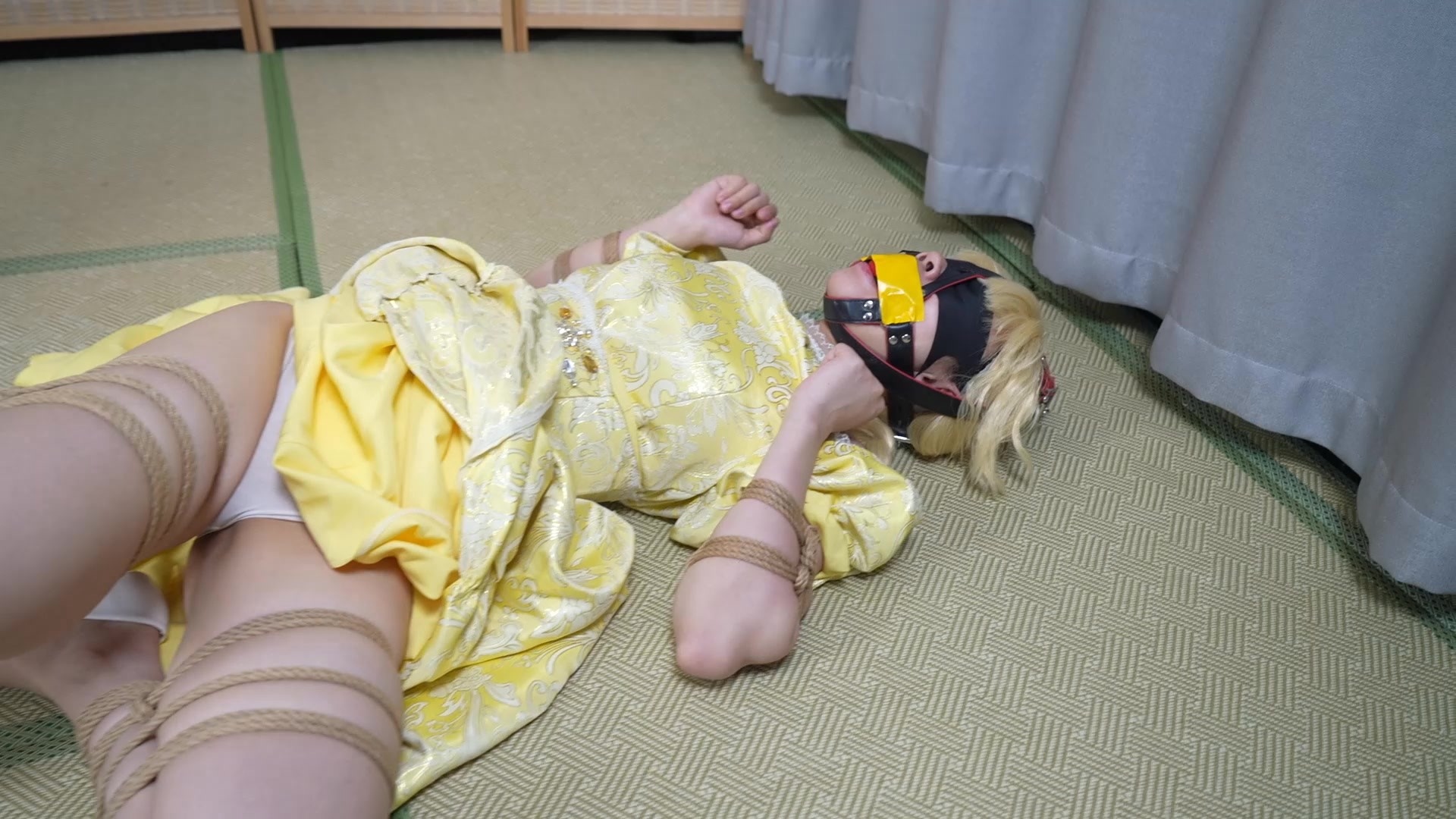 嘴巴塞进丝袜戴上马具口球,最外面再用胶带封住