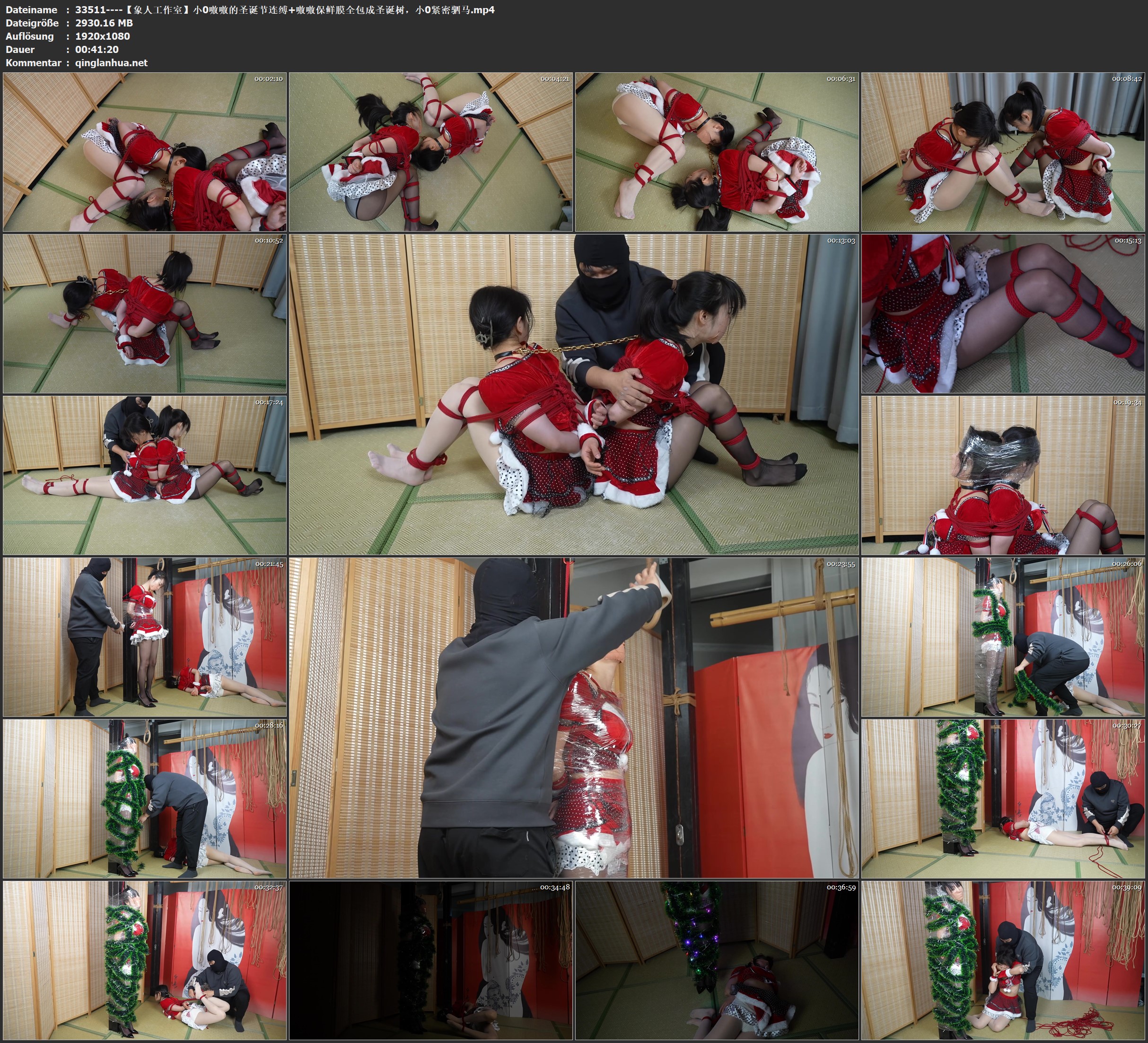 穿着圣诞服装的小0和嗷嗷本想一起共度佳节,却不知为什么分别被紧缚捆绑起来,嘴巴和鼻子都被胶布封住,十分难受。被绑着的她们试图协作脱缚,换来的却只是紧密的连缚,还被戴上项圈用链子栓在一起。一番挣扎后,她们精疲力尽,晕了过去。
