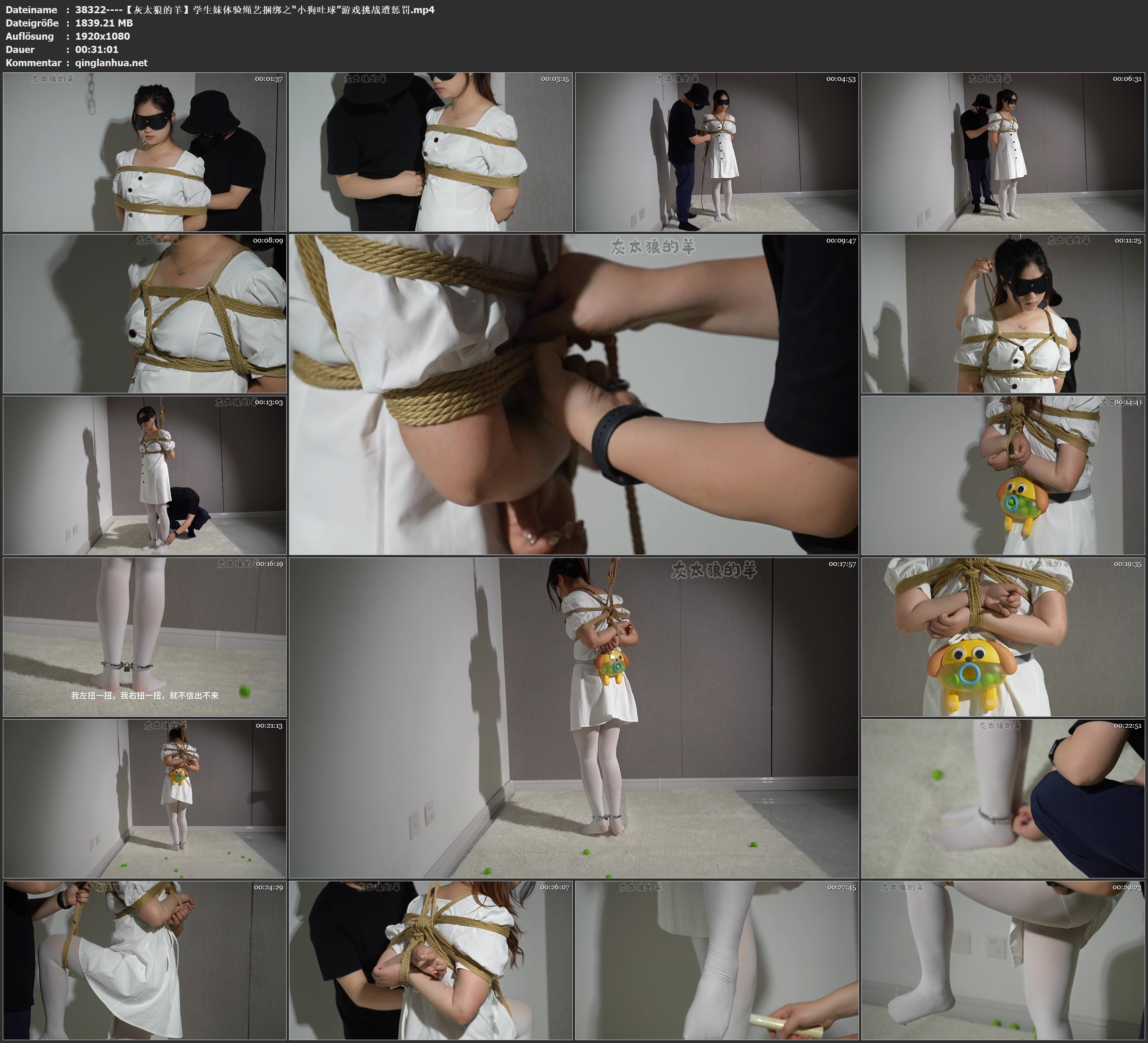 戴上独属于自己的眼罩,视线变得一片漆黑,绳子在上身缠绕,越来越多,越来越紧,很快灰太狼就将上身绑好,用一根绳子将倩茹的和扣环链接, 接着又拿出了一副脚铐,将倩茹的双脚连在一起,一切准备就绪后,灰太狼才告诉倩茹要陪她玩个游戏,游戏规则在规定的时间内将道具小狗嘴里的球全部摇出就算挑战成功,如果剩余的球球过多要接受惩罚,期间不能跳只能扭。听完后倩茹觉得这简直太简单了,非常有自信,迫不及待地让灰太狼赶紧开始,戴上小狗道具的倩茹疯狂的扭动屁股,左扭扭,右扭扭期待着球球赶紧掉落,扭动的屁股像是开了加速器般停不下来,时间一分一秒地过去,球球并没有顺倩茹的心意全部掉下,拼尽全力也只出来了十个,灰太狼说挑战失败,需要接受惩罚。倩茹悬着的心终于死了,还是逃不过惩罚,灰太狼将倩茹的一条腿吊起,用牙刷不停地挠着她的脚心,“嗯嗯~嗷嗷”的声音此起彼伏