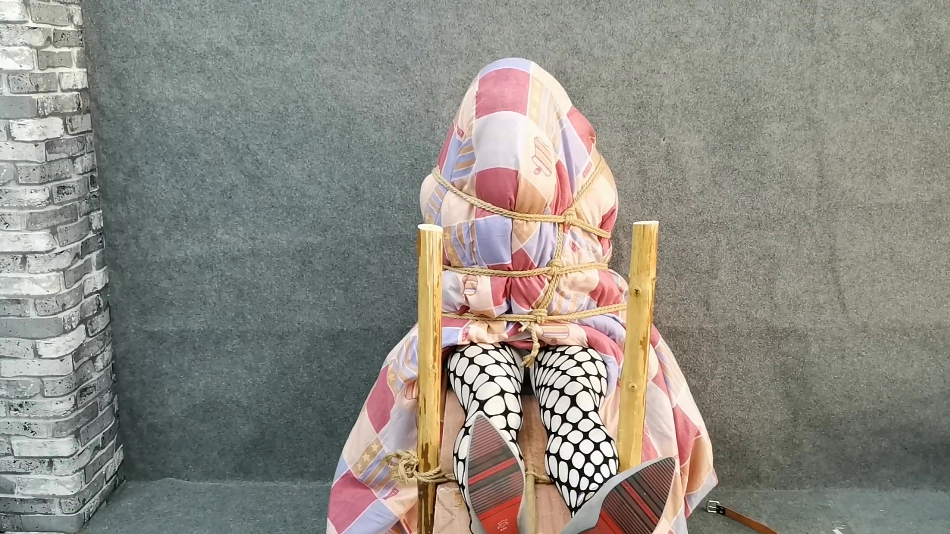 上次玩了一次气功游戏,说以后不在玩此游戏,过了几天,看到新购的皮帽,主动要求在尝试一次,挑战喘气最难受的一种绑法,就是五花勒勃,本来喘气就困难,又加三层棉被,而且每层棉被用绳子紧紧绑住,用木棒敲打,她在里面都不觉得疼,证明三层被子非常的厚,而且密封也好,下面又固定一个[手动滑稽],瞬间GC,云儿只能在里面哼、哼、哼啦