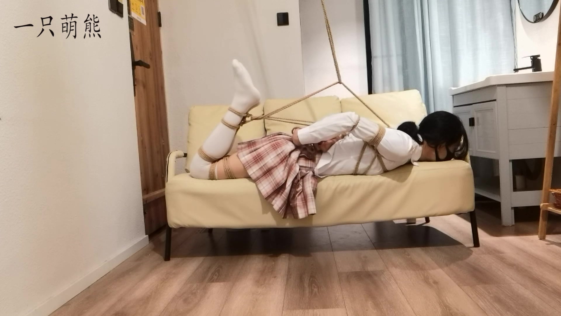 试个新的自缚方法,从小说里看到的一个自缚方法,绑好胸和腿然后拿一根绳子两头都做收紧套,一头从脚腕穿过去,把收紧套一分为二两只手臂分别从两边穿过去套在手臂上,然后从脖颈后面绳子穿过去搭在背后,双手再伸进去,我在这个方法上又增加了一个吊绳,这样从沙发上下来,绳子被吊紧,手臂跟手腕就被双向拉紧~拘束感更强了~